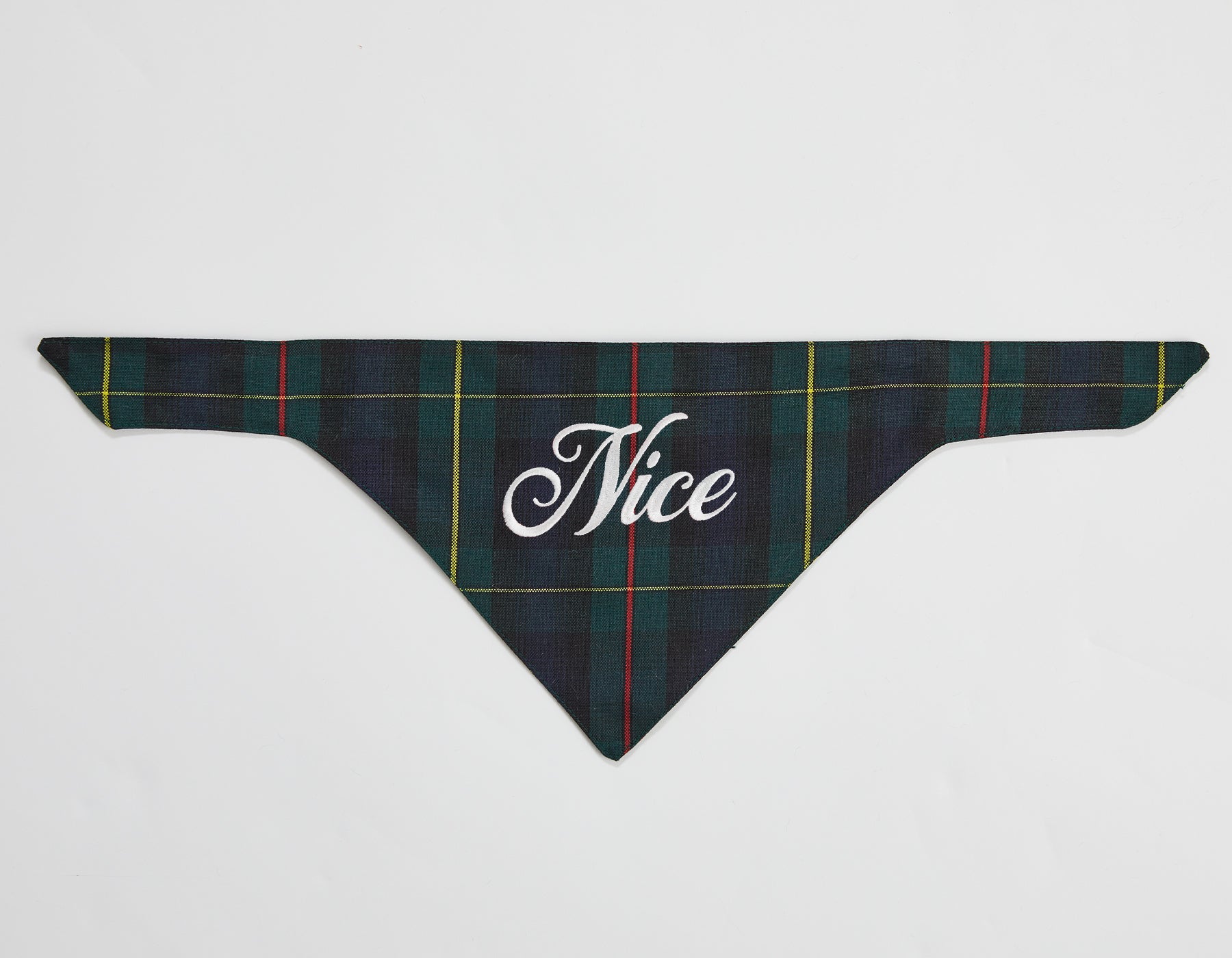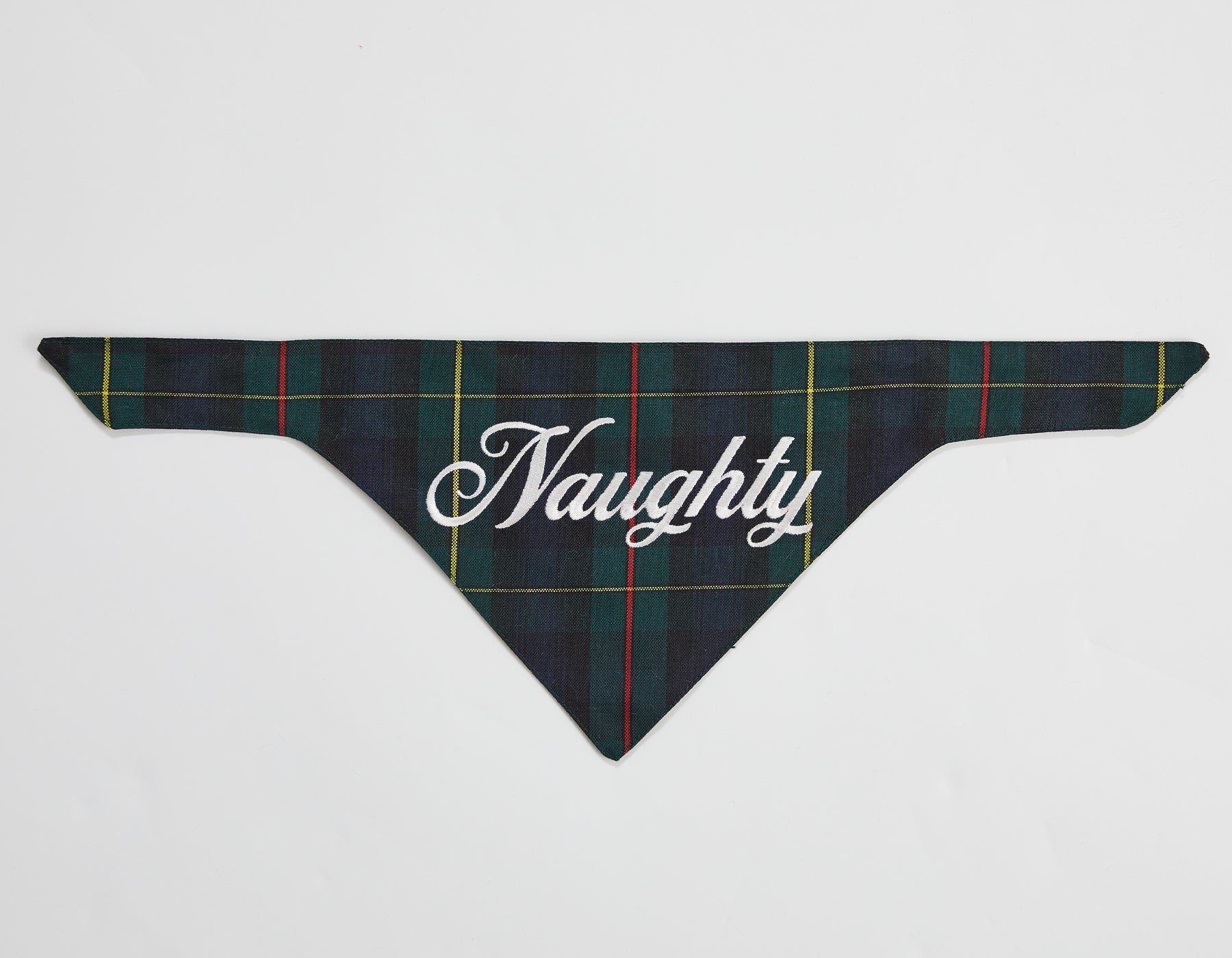 A classic tartan plaid in green, red, navy and yellow made from a heavyweight cotton fabric. Reversible, one side is embroidered with Nice; the other side is embroidered with Naughty. High quality and machine washable, this one-of-a-kind piece is the MUST HAVE accessory for the holidays.