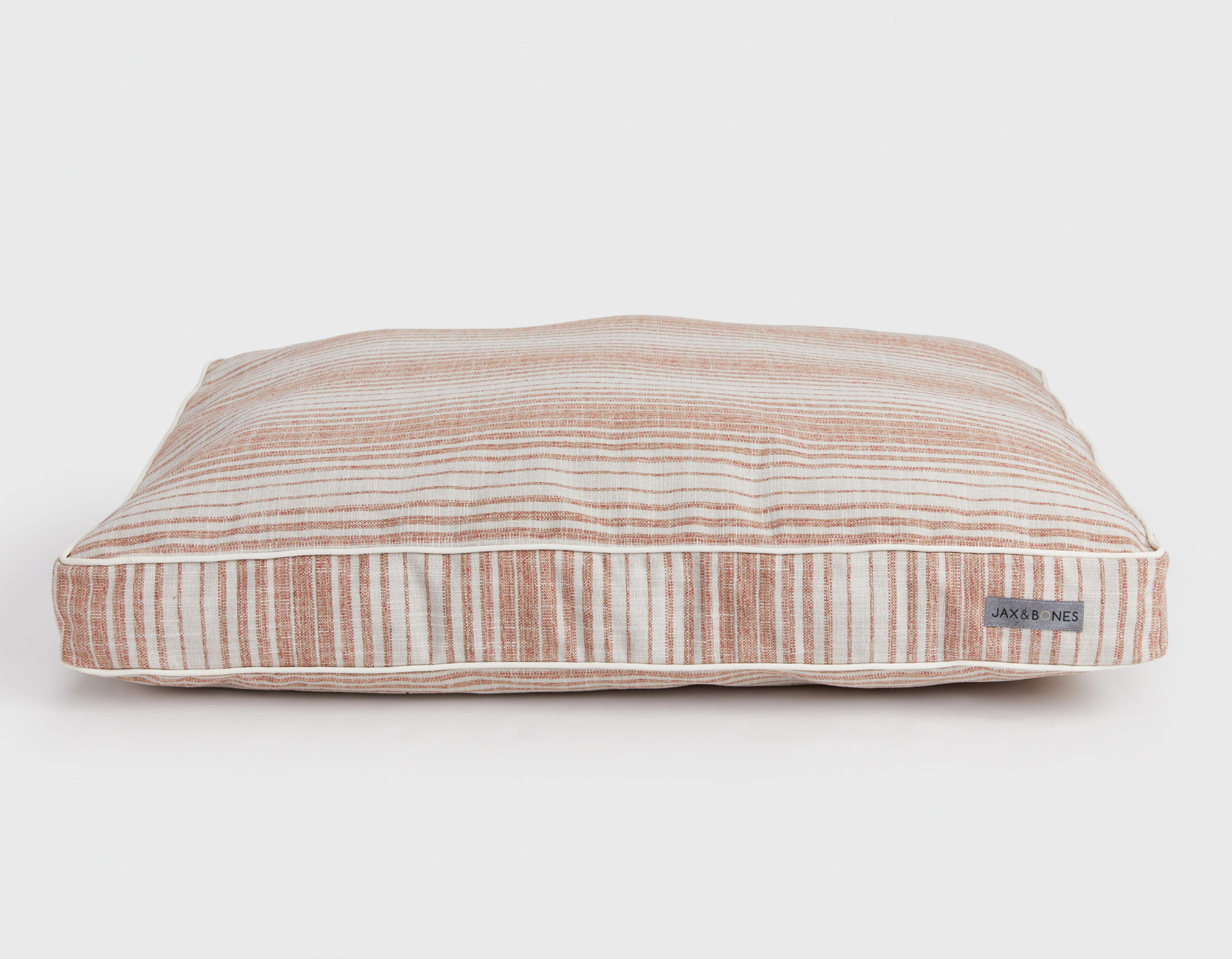 The Jax & Bones signature Rectangle Pillow Bed is designed with one thing in mind--to give maximum comfort for years to come. These pillow beds are overstuffed and channeled to prevent flattening or condensing. Cover zips off and is 100% machine washable. Constructed using top-of-the-line heavyweight textured fabric that looks and feels like wool but is made from a durable blend of polyester. Excellent for heavy traffic and durable for any breed. Breathes well and hides shedding hair.