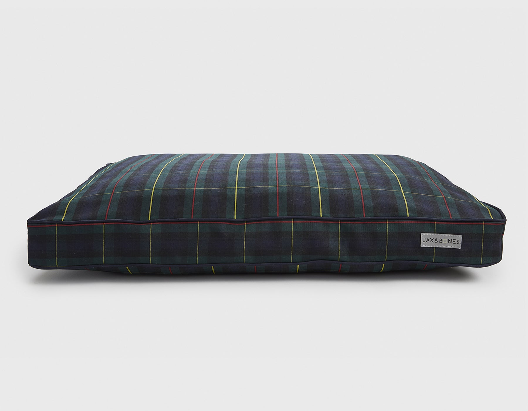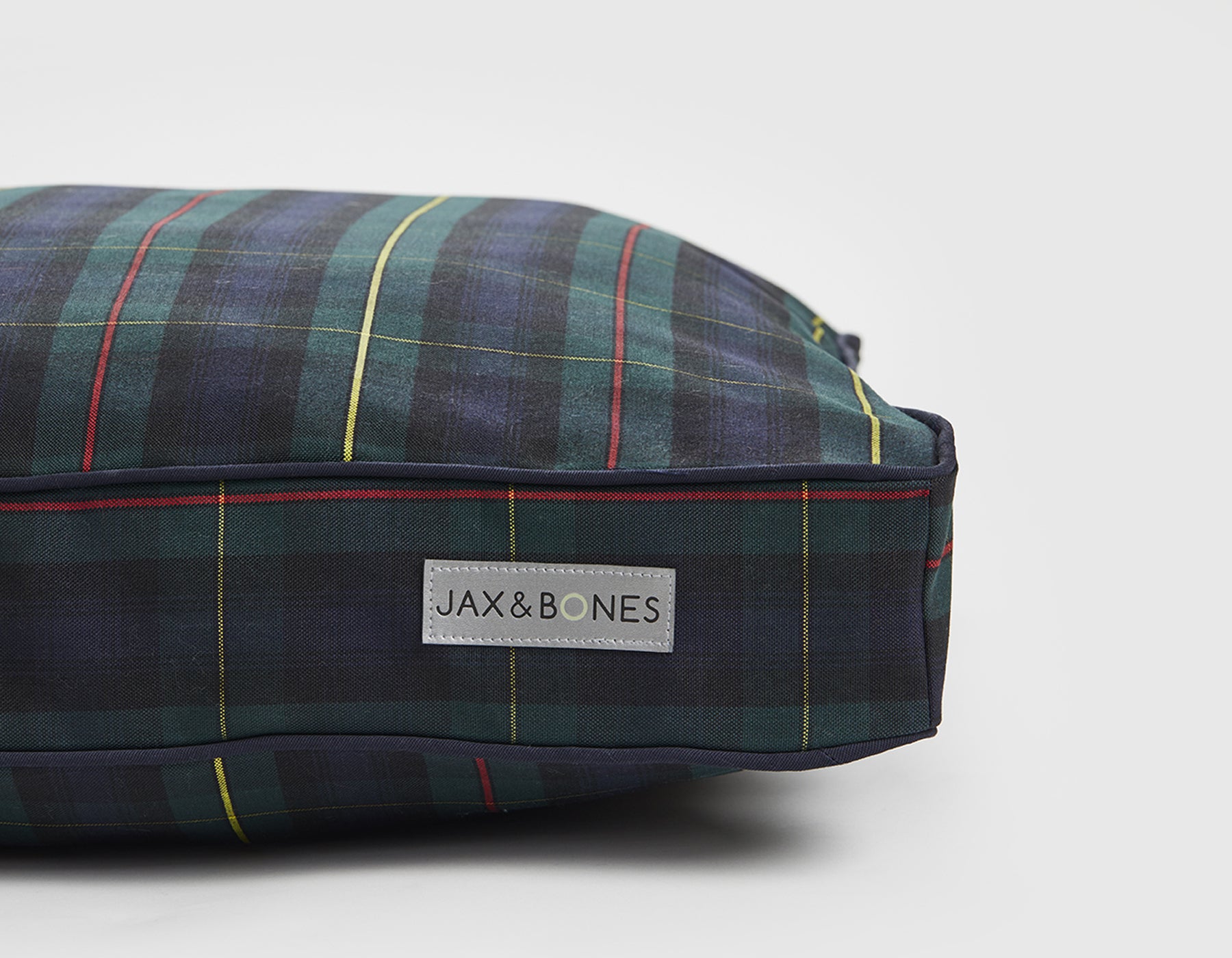 A holiday classic! A classic tartan plaid in navy, green, red and yellow made from a heavyweight cotton fabric. The Jax & Bones signature Rectangle Pillow Bed is designed with one thing in mind--to give maximum comfort for years to come. These pillow beds are overstuffed and channeled to prevent flattening or condensing. Cover zips off and is 100% machine washable. Constructed using top-of-the-line heavyweight textured fabric. Excellent for heavy traffic and durable for any breed. Breathes well and hides shedding hair.