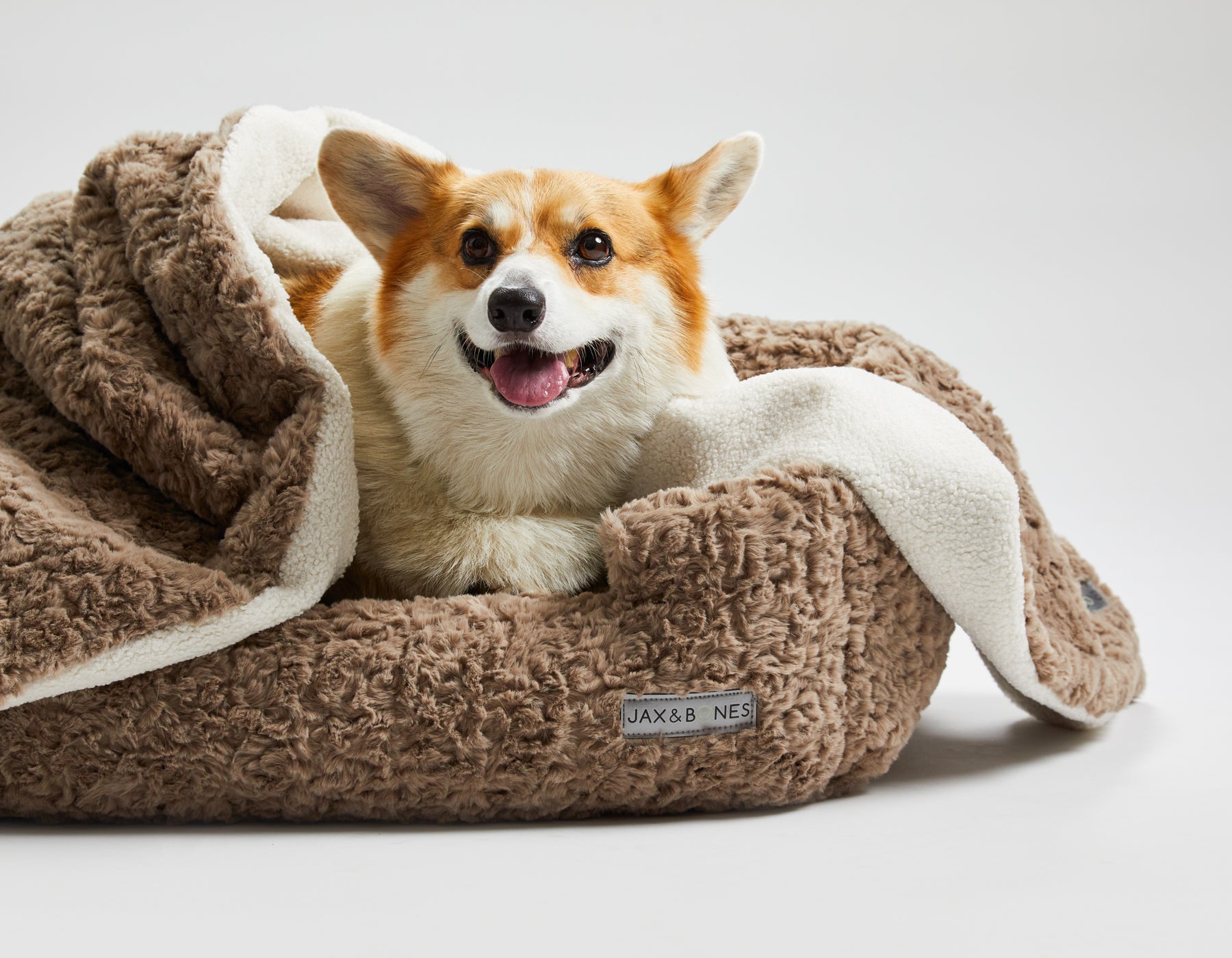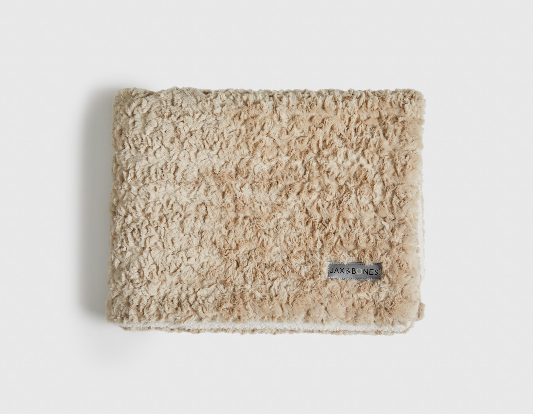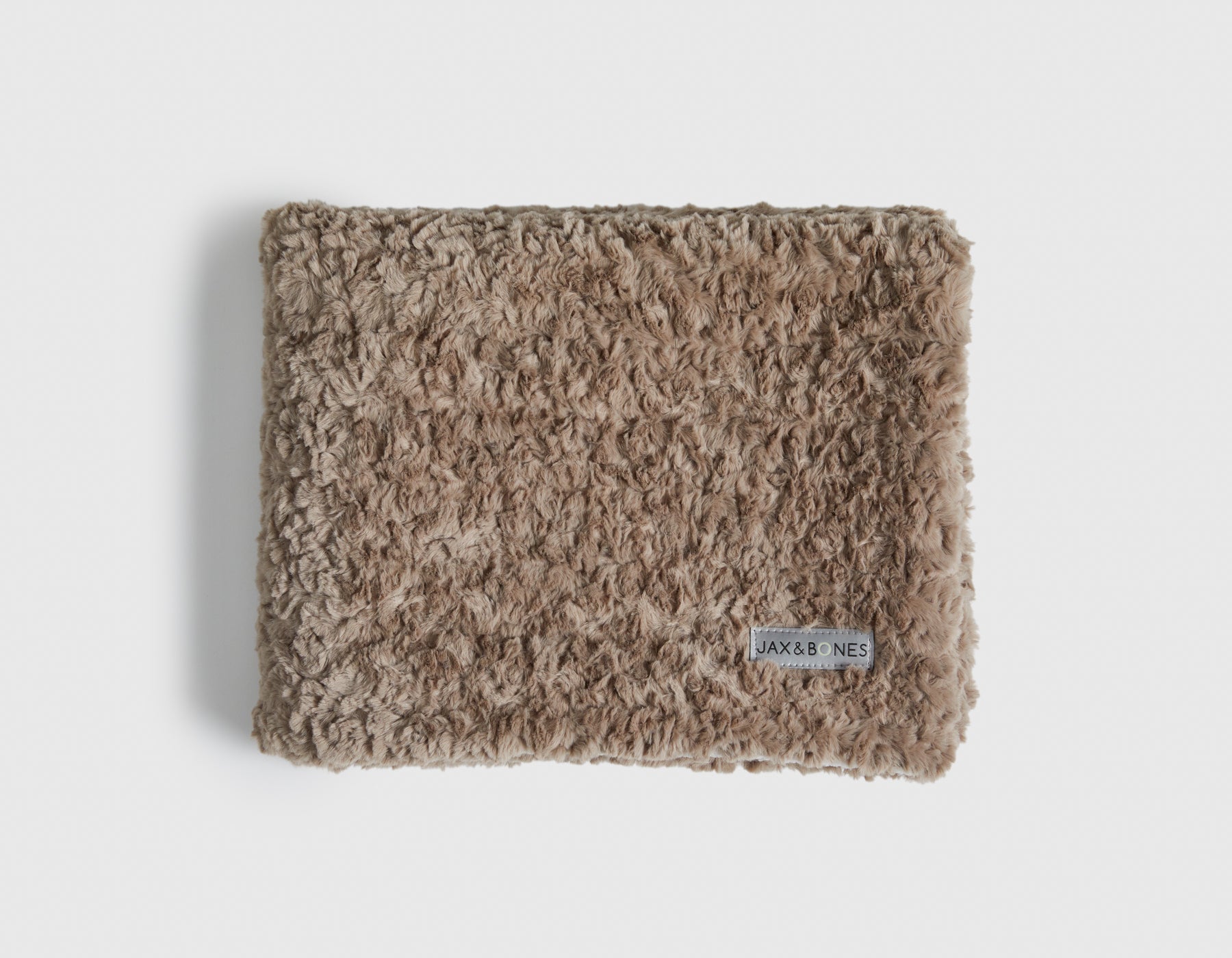 Available in Butterscotch, Mocha, and Winter, each blanket features a soft white plush lining that adds warmth without weight. A modern essential for every snuggly pup.