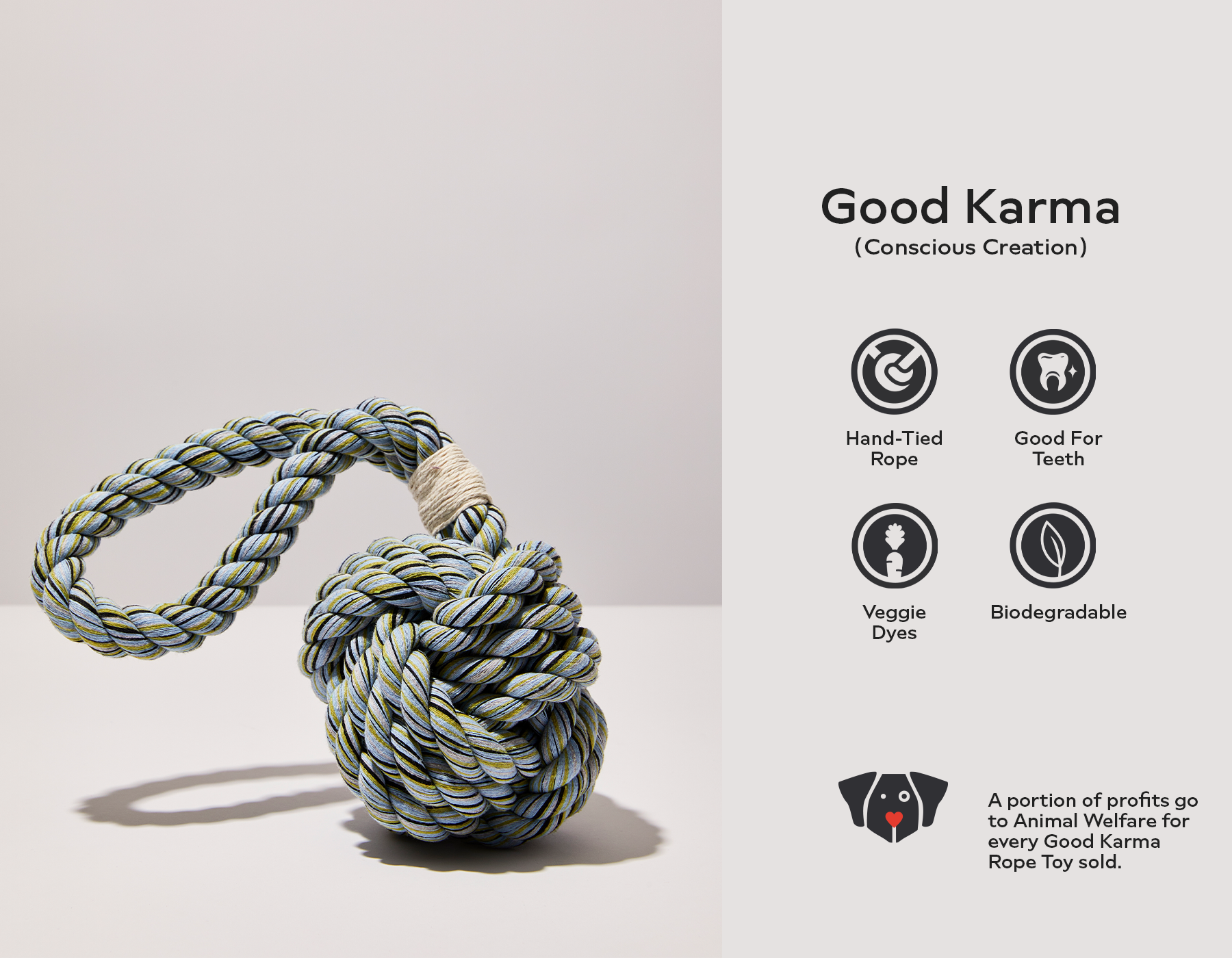 Our Good Karma Celtic Knot Rope Toys are perfect for tug and war games. Safely made with non toxic dyes, as your dog chews, our rope toys fray and act like doggie dental floss. And at Jax & Bones, we believe in playing it forward, so with every purchase of a Good Karma toy, we donate 10% of the proceeds to rescue and animal welfare groups to help these animals find a forever home.
